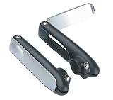 Stout all-metal construction with real glass mirrors. Easy installation and comfortable as grips whether or not mirrors are deployed. The design compromise is that the mirrors are vertically short, making the image difficult to assess at a glance. Once unfolded, the mirrors pivot on a horizontal axis through a fixed set of detents, so the optimum grip angle may not coincide with a useful pivot setting.